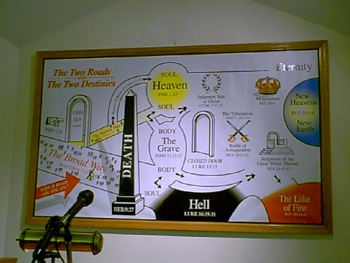Two Roads Charts For Sale Medium gloss vinyl simplified "Two Roads and Two Destinies" charts are available. Size 8 feet by 4 feet. Cost $125 US, $150 Canadian includes all applicable taxes. Example below is in Garnavillo IA Gospel Hall. Over 100 of these charts are in use in Canada, United States, Northern Ireland and the rest of the United Kingdom.
